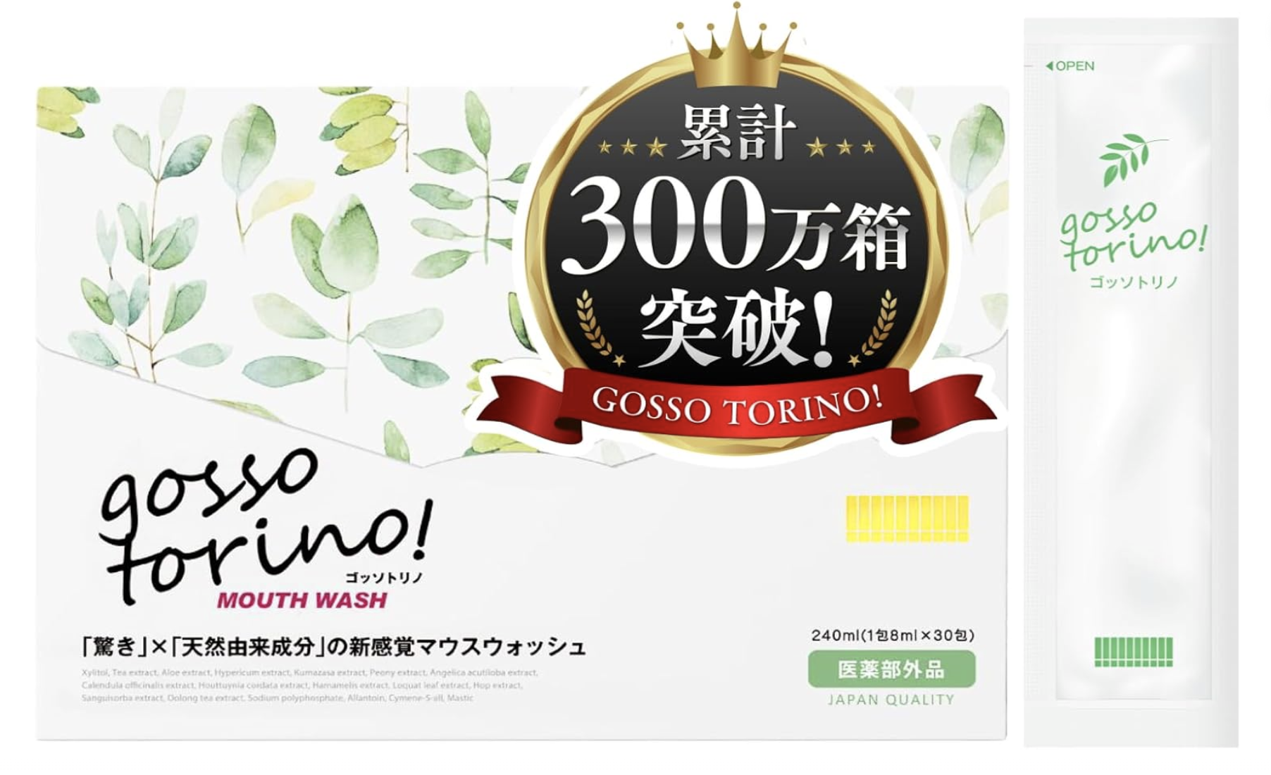 ⚠️正規品はサン・クラルテ製薬で販売しております。 ⚠️ご購入の際は必ず本ページの画像を確認の上、ご購入下さい。✨口腔ケアにこだわりをもったユーザーに認められて累計販売数300万箱突破!ゴッソトリノは、オーラルケアの専門家も勧める製薬会社が手掛けた注目のマウスウォッシュです。わずか15秒すすぐだけで、口臭の原因となるたんぱく質や細菌をしっかり除去*し、 実際に汚れが見える驚きの効果を実感していただけます。* ブラッシングによる効果 ✨厳選したトリプル有効成分を配合:国が認めた成分シメン-5-オール×アラントイン×ポリリン酸を配合。イやな口臭の原因は、虫歯や歯周炎などが原因と言われています。Wの有効成分は、そんな歯のトラブルを予防し、お口のニオイをケアします。※パッケージに記載の医薬部外品の効能効果 ✨口臭の原因となるたんぱく質をゴッソリ除去*:たった15秒すすぐだけで、歯ブラシが行き届かない口内のすみずみまで浸透。ゴッソトリノは、液体なので、歯ブラシではケアが難しい歯の隙間や舌など口腔内全体をケアすることができ、口臭の元となる唾液や食物のカスなどに含まれるたんぱく質までしっかり除去します。ホワイトニングのためにも活用できます。 *ブラッシングによる効果 ✨10種類の植物由来成分配合:ビワ葉エキス、ウーロン茶エキス、クマザサエキス、ワレモコウエキス、ホップエキス、トウキエキス、ドクダミエキスなどのこだわりの15種類のボタニカル由来の成分を使用。マウスウォッシュ独特の強い刺激が無く、鼻にツンとくる味がしないので、気軽にお使いいただけます。また、低刺激なのでお口に優しく小さいお子様でも安心してご使用いただけます。 ✨ホワイトニング効果*:マウスウォッシュでお口の中をきれいにした後、歯ブラシでブラッシングすることで、口臭ケアや虫歯予防にプラスしてホワイトニング効果も期待できます。 *ブラッシングによる効果 ※パッケージに記載の医薬部外品の効能効果 ✨ 6つのフリー設計:毎日欠かさずに使うものだからこそ鉱物油、紫外線吸収剤、合成着色料、漂白剤、シリコン、石油系界面活性剤の6つの体の負担になる不要な成分は一切使用しておりません。 ✨いつでもどこでも使いやすい個包装タイプ:🦷衛生的:ボトルタイプのマウスウォッシュのように、キャップを繰り返し使わないので、とても衛生的。🦷持ち運び自由:外出時に必要な分だけを持ち運ぶことができるので、会社や旅行先、デート前、食事の後などでもサッと口臭予防ができます。