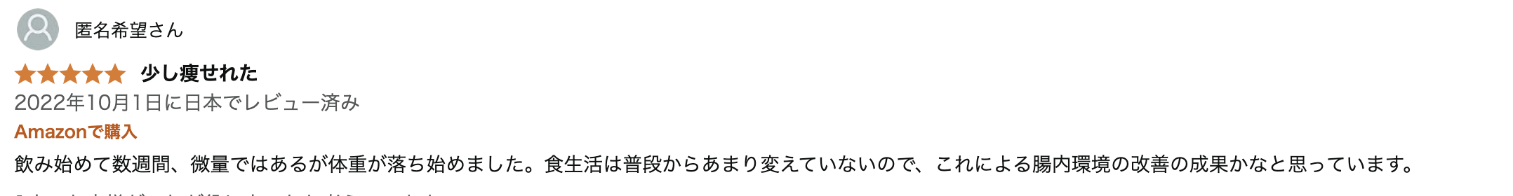 飲み始めて数週間、微量ではあるが体重が落ち始めました。食生活は普段から変えてないので、これによる腸内環境の改善の成果かかなと思っています。