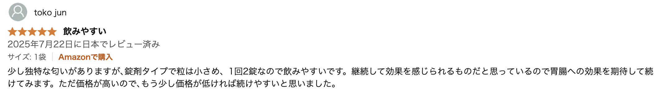 少し独特な匂いがありますが、錠剤タイプで粒は小さめ、1回2錠なので飲みやすいです。継続して効果を感じられる物だと思っているので胃腸への効果を期待して続けてみます。ただ価格が高いので、もう少し価格が低ければ続けやすいと思いました。