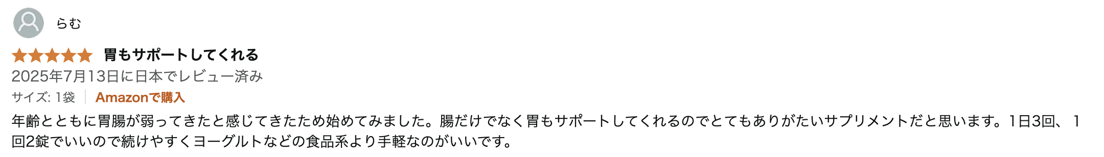 年齢とともに胃腸が弱ってきたと感じて来たため始めてみました。腸だけでなく胃もサポートしてくれるのでとてもありがたいサプリメントだと思います。1日3回、1回2錠で良いので続けやすくヨーグルトなどの食品系より手軽なのがいいです。